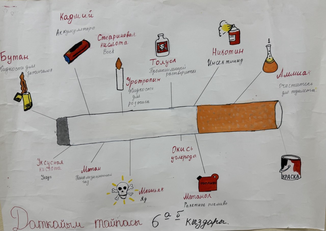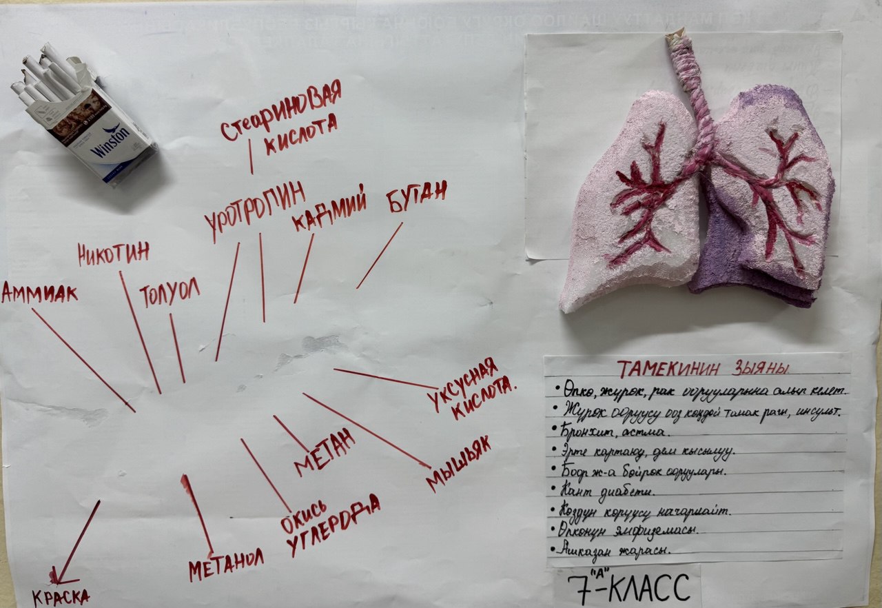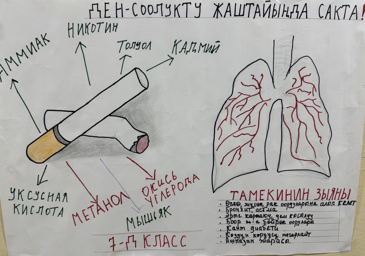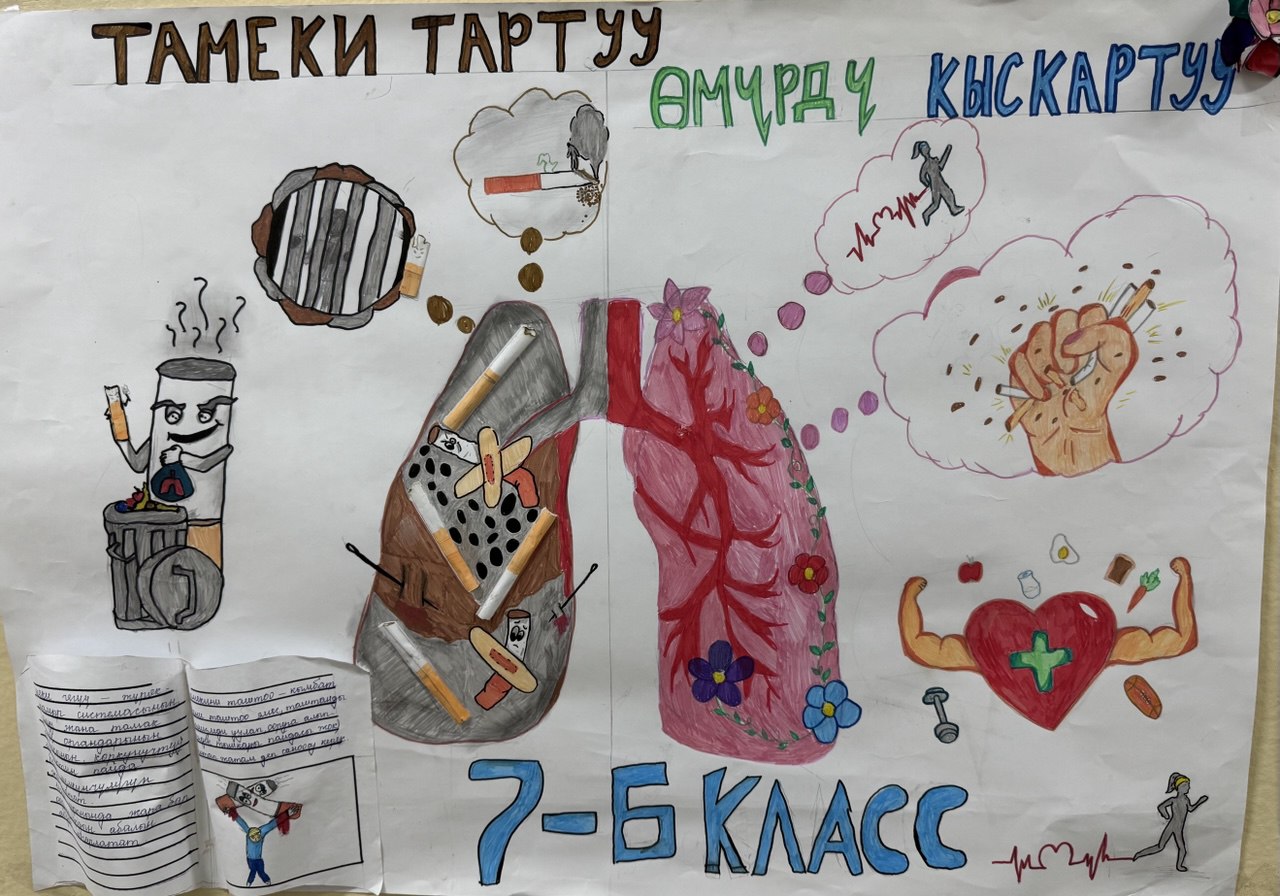 “Тандоо сенин колуңда: тамеки же ден соолук” деген темада окуучулар арасында иш чаралар өткөрүлдү. Иш-чаранын негизги максаты-окуучуларга тамекинин адамдын ден соолугуна тийгизген зыяны тууралуу маалымат берүү, зыяндуу адаттардан алыс болууга үндөө жана сергек жашоо образын калыптандыруу болду. Эмне үчүн тамекиге “ жок “ деп айтышыбыз керек? деген суроонун негизинде окуучулар тарабынан дубал газеталары даярдалып, анда тамекинин адам ден соолугуна тийгизген зыяны, сергек жашоо образы жана “Тандоо сенин колуңда: тамеки же ден соолук” темасына байланыштуу ураандар, сүрөттөр чагылдырылды.